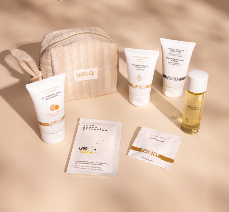Набір підходить як для спільного використання, так і для неспішного знайомства з продуктами бренду YESforLOV у зручному форматі. Оксамитова косметичка з лімітованої серії робить комплект практичним і стильним.